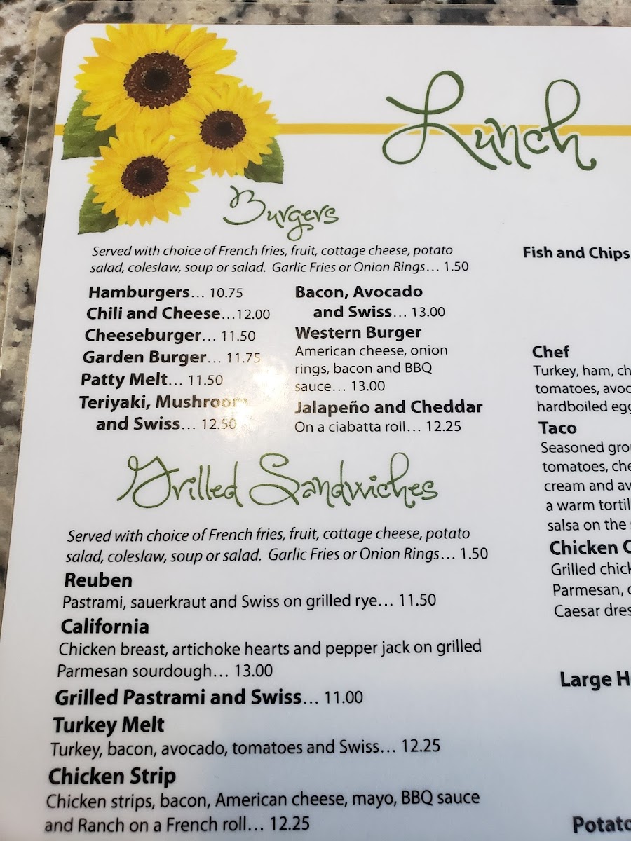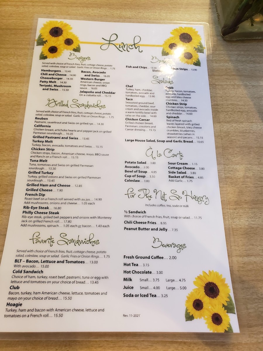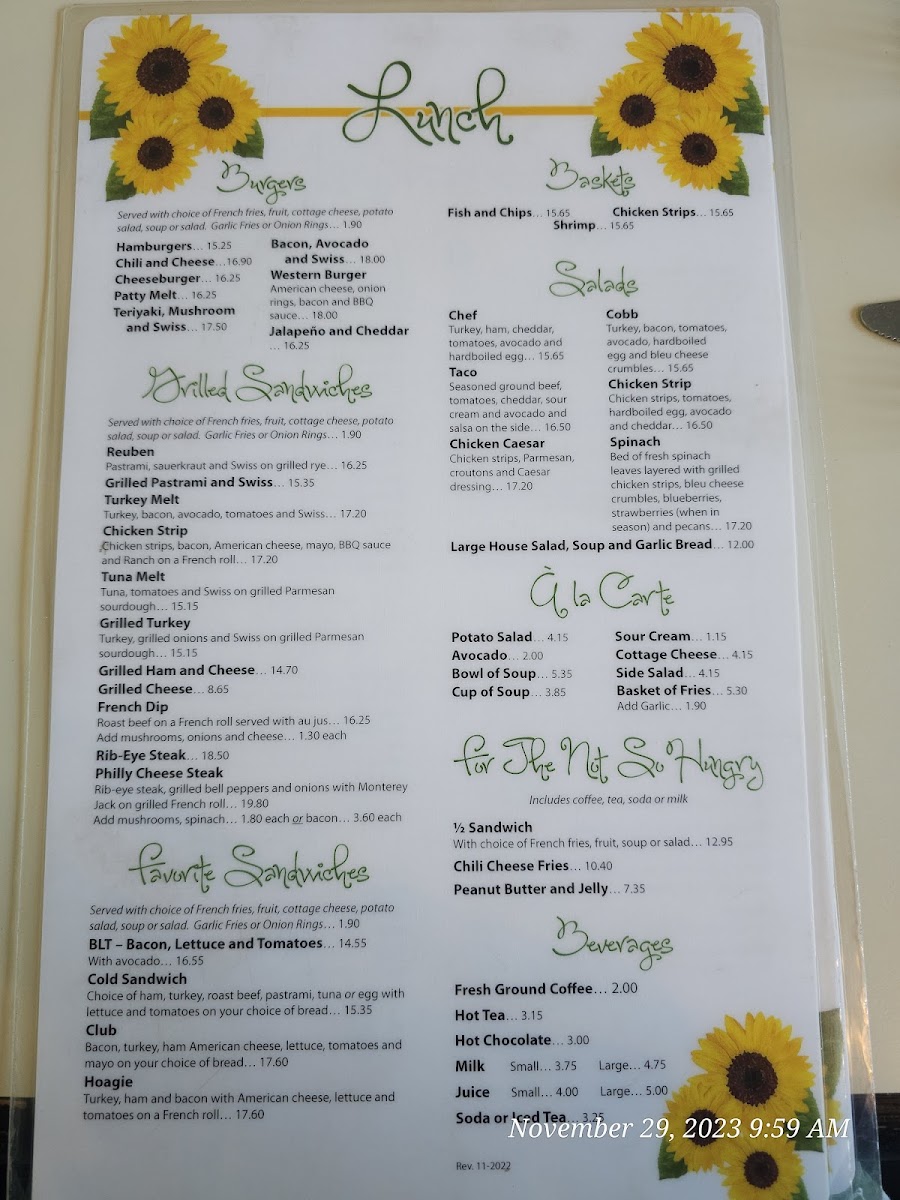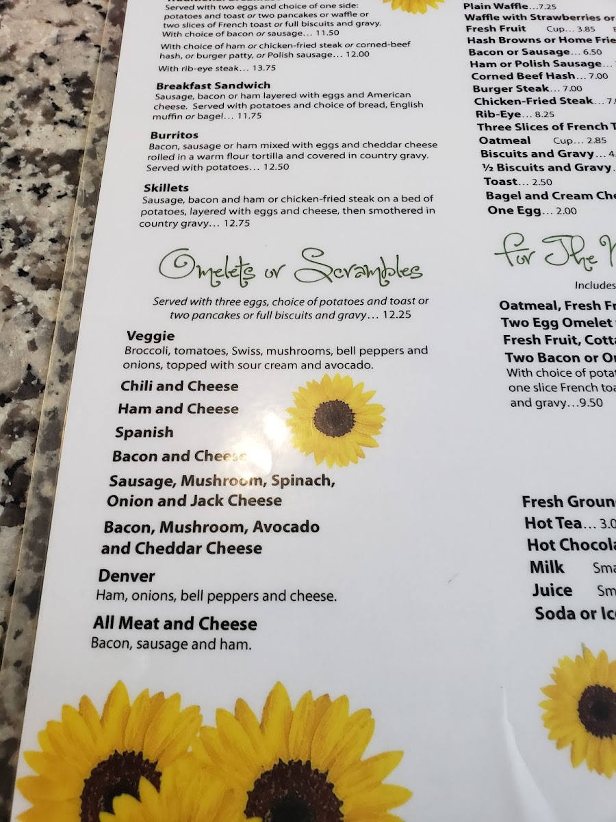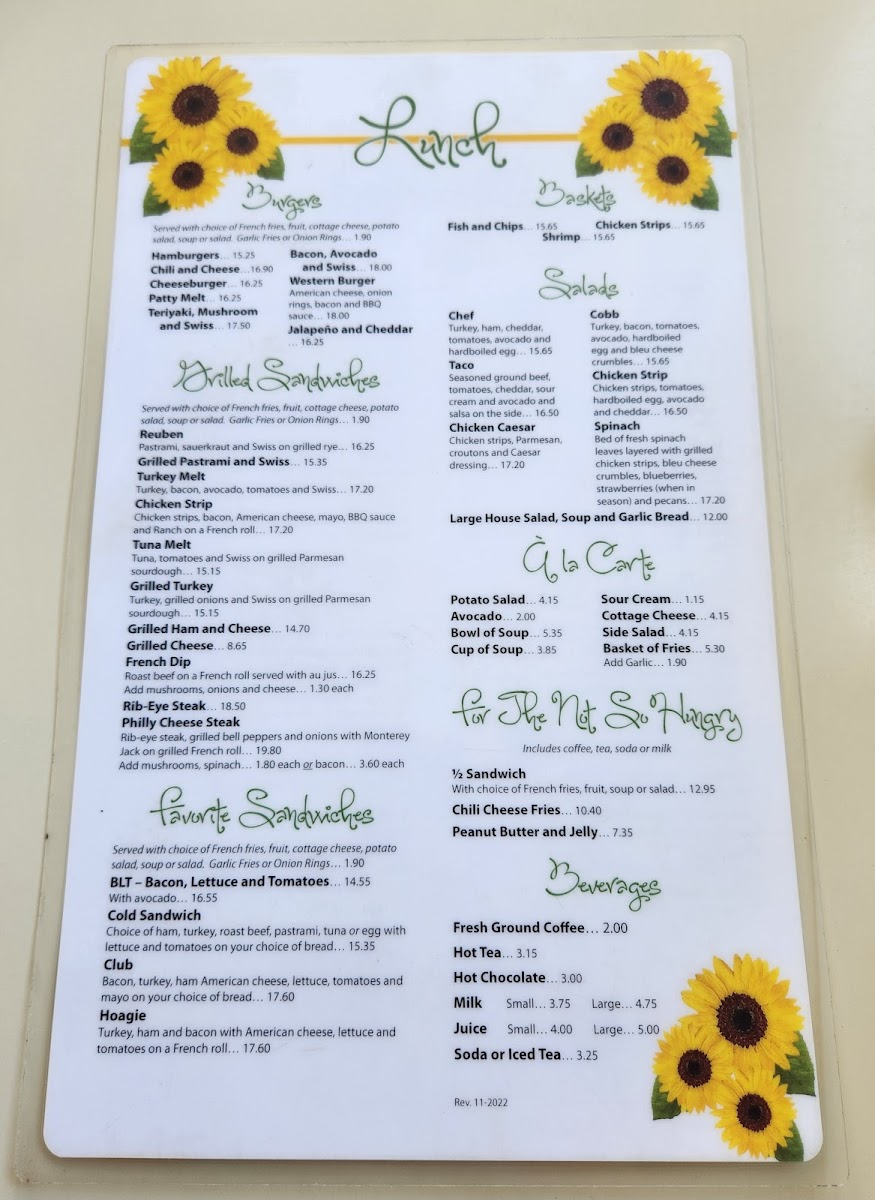 The menu is organized into clear categories for breakfast favorites, skillets, sandwiches, and lighter lunch choices. Patrons can expect ample portion sizes with a focus on traditional American breakfast and hearty lunch dishes. This menu is suitable for morning meals, brunch, and casual midday dining, accommodating both quick orders and relaxed sit-down meals.